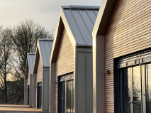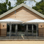 4 einzelne gruppenhäuser verbunden mit einer rückseitigen versorgungsspange in holzmassiv- bauweise mit 20cm dämmung inkl 30cm dämmung im dach. fassade aus eingefärbten stehfalzblech mit elementen aus lärchenschalung bzw trespaplatten.