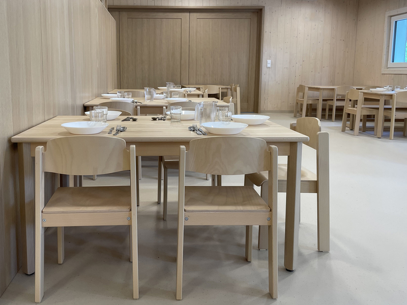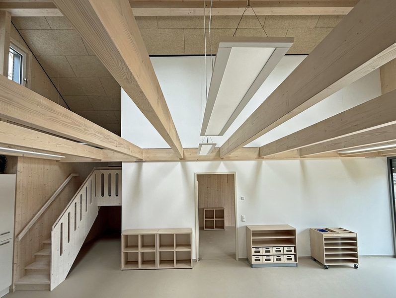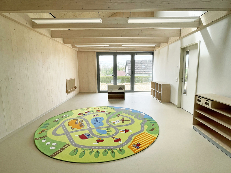 anbau an best. kindergarten aus stahlbetonskelettbau mit aussenwänden aus massivholz-dübelwänden mit 24 cm steicowallträgern und 6 cm weichfaserplatten mit holzfaserdämmung ausgeblasen. Inneneinrichtung mit alea architektur martin brenner.