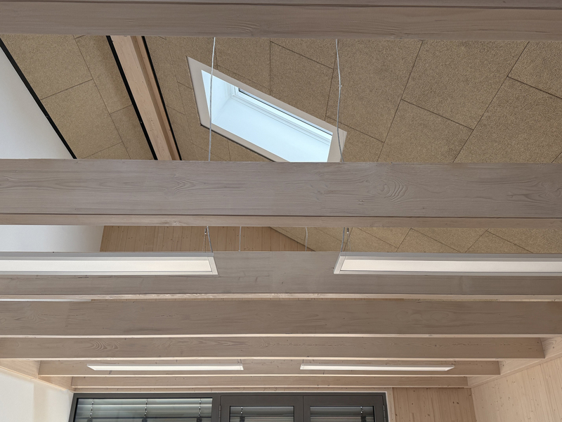 neubau an best. kindergarten mit zwischenbau als neuen eingangsbereich. bauweise aus massivholzwänden mit 30cm dämmung. sanierung des altbaus zu einer kindergartengruppe mit bewegungsraum im dachgeschoss
